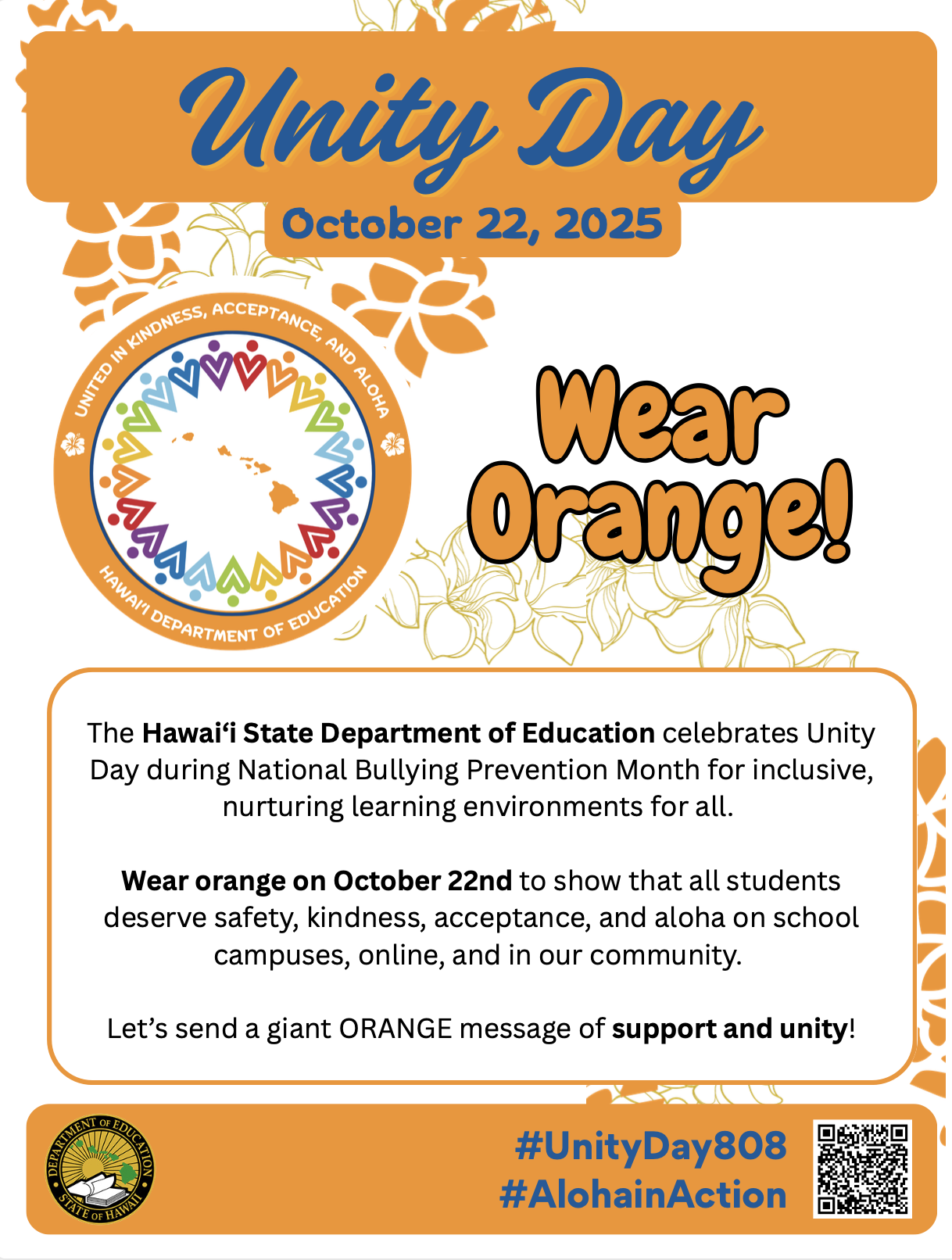 Unity Day *see flyer (PDF) for details. Please be sure your orange outfit is school appropriate and follows our dress code. Attached Files 2. 091525 Unity Day Flier.pdf