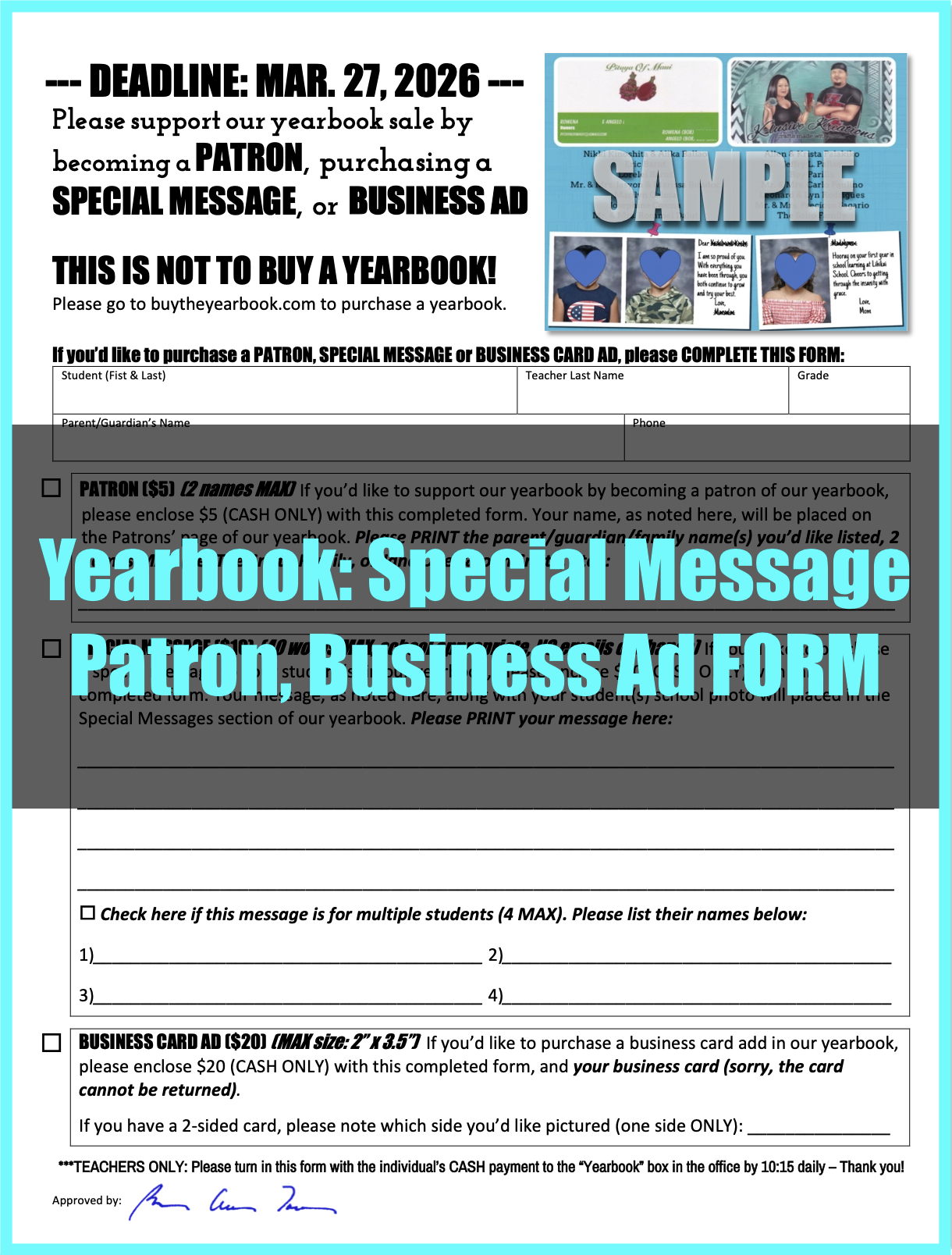*THIS IS NOT TO PURCHASE A YEARBOOK - SEE YEARBOOK FLYER TO BUY A YEARBOOK*
